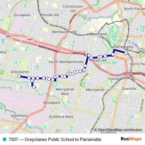 The first stop of the 7507 bus route is Greystanes Public School, Merrylands Rd and the last stop is Parramatta Station, Stand A1. 7507 (Greystanes Public School to Parramatta) is operational during on weekdays.