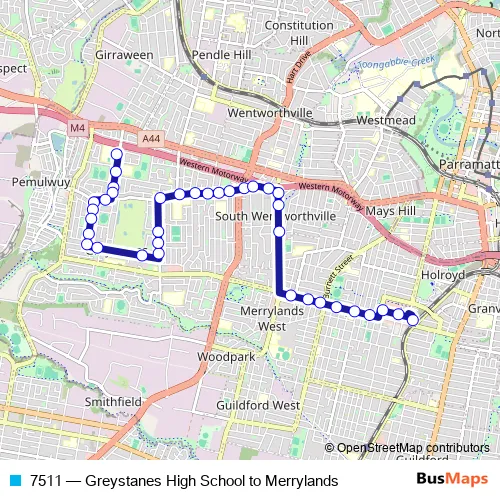 The first stop of the 7511 bus route is Greystanes High School Near Beresford Rd and the last stop is Merrylands Interchange, Terminal Pl - Stand 2. 7511 (Greystanes High School to Merrylands) is operational during on weekdays.