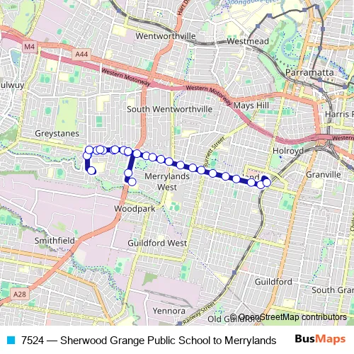 The first stop of the 7524 bus route is Sherwood Grange Public School, Bruce St and the last stop is Merrylands Interchange, Terminal Pl - Stand 2. 7524 (Sherwood Grange Public School to Merrylands) is operational during on weekdays.
