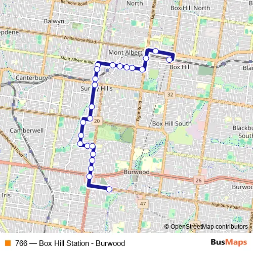 The first stop of the 766 bus route is Box Hill Bus Station/Station St and the last stop is Burwood Hwy/Warrigal Rd. 766 (Box Hill Station - Burwood) is operational during everyday.