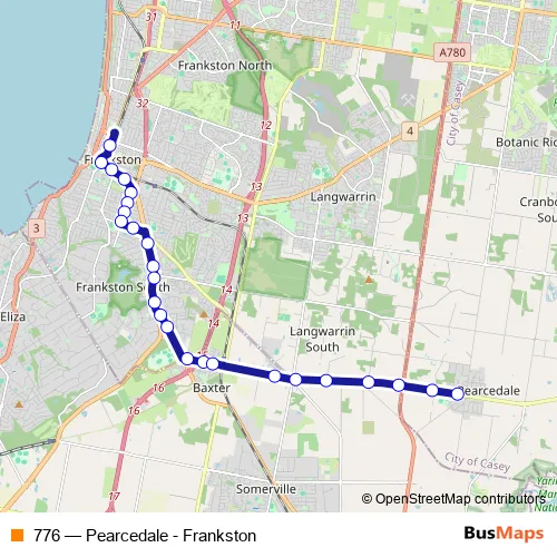 The first stop of the 776 bus route is Frankston Railway Station/Young St and the last stop is Pearcedale Village SC/Baxter-Tooradin Rd. 776 (Pearcedale - Frankston) is operational during everyday.