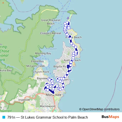 The first stop of the 791n bus route is Pittwater Rd Opp Loquat Valley Rd and the last stop is Ocean Pl At Ocean Rd. 791n (St Lukes Grammar School to Palm Beach) is operational during on weekdays.