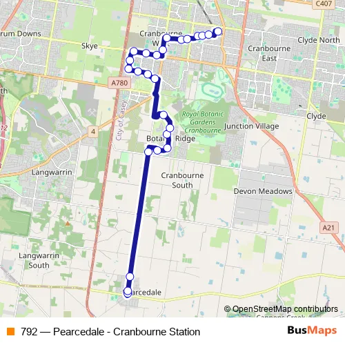 The first stop of the 792 bus route is Baxter-Tooradin Rd/Pearcedale Rd and the last stop is Cranbourne Station/Station St. 792 (Pearcedale - Cranbourne Station) is operational during everyday.
