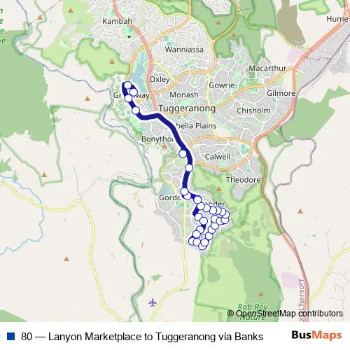 The first stop of the 80 bus route is Box Hill Av opp Lanyon Marketplace and the last stop is Tuggeranong Interchange Arrivals. 80 (Lanyon Marketplace to Tuggeranong via Banks) is operational during everyday.