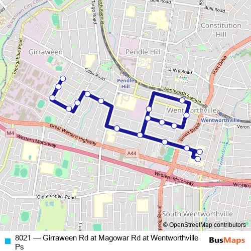 The first stop of the 8021 bus route is Girraween Rd At Magowar Rd and the last stop is Wentworthville Public School, Fullagar Rd. 8021 (Girraween Rd at Magowar Rd at Wentworthville Ps) is operational during on weekdays.