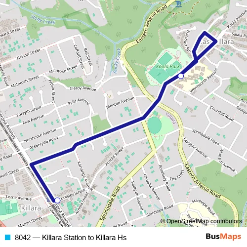 The first stop of the 8042 bus route is Killara Station, Locksley St and the last stop is Killara High School, Koola Av. 8042 (Killara Station to Killara Hs) is operational during on weekdays.