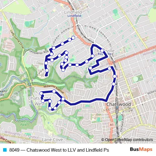 The first stop of the 8049 bus route is Fullers Rd At Bellevue St and the last stop is Lindfield Public School, Grosvenor Rd. 8049 (Chatswood West to LLV and Lindfield Ps) is operational during on weekdays.