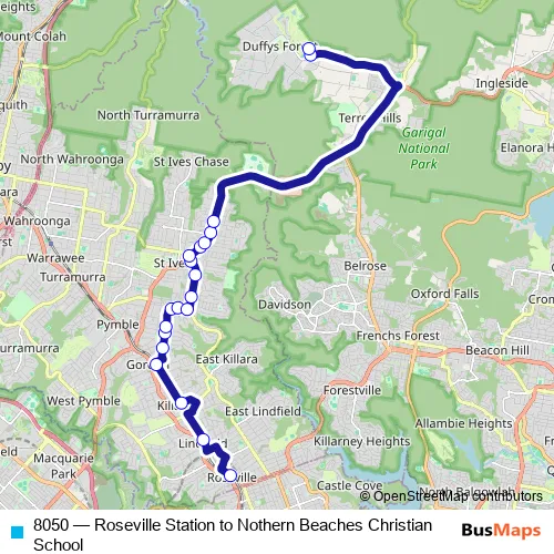 The first stop of the 8050 bus route is Roseville Station, Hill St and the last stop is Northern Beaches Christian School, Echunga Rd. 8050 (Roseville Station to Nothern Beaches Christian School) is operational during on weekdays.