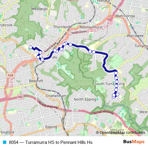The first stop of the 8054 bus route is Turramurra High School, Maxwell St and the last stop is Pennant Hills High School, Laurence St. 8054 (Turramurra HS to Pennant Hills Hs) is operational during on weekdays.