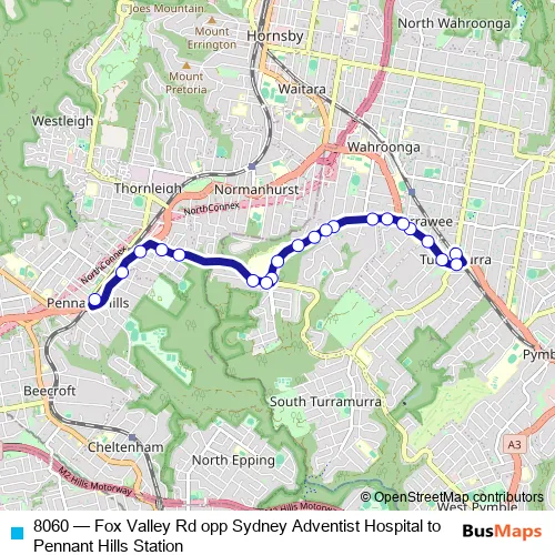 The first stop of the 8060 bus route is Turramurra Station, Stand A and the last stop is Pennant Hills Station, Railway St, Stand D. 8060 (Fox Valley Rd opp Sydney Adventist Hospital to Pennant Hills Station) is operational during on weekdays.