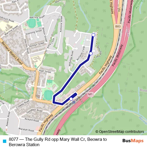 The first stop of the 8077 bus route is The Gully Rd Opp Mary Wall Cres and the last stop is Berowra Station, Pacific Hwy. 8077 (The Gully Rd opp Mary Wall Cr, Beowra to Berowra Station) is operational during on weekdays.