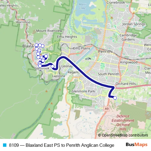 The first stop of the 8109 bus route is Blaxland East Public School, Old Bathurst Rd and the last stop is Cross Rd Penrith Anglican College. 8109 (Blaxland East PS to Penrith Anglican College) is operational during on weekdays.