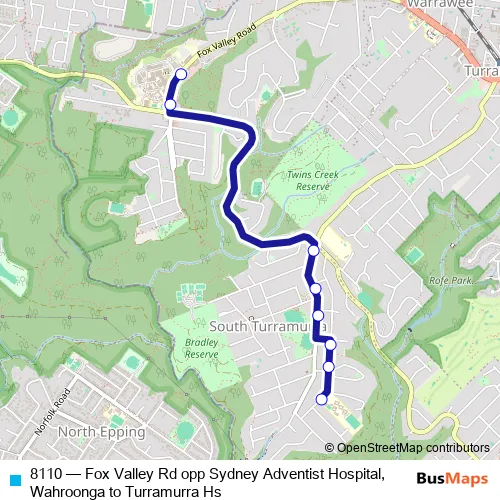 The first stop of the 8110 bus route is Fox Valley Rd Opp Sydney Adventist Hospital and the last stop is Turramurra High School, Maxwell St. 8110 (Fox Valley Rd opp Sydney Adventist Hospital, Wahroonga to Turramurra Hs) is operational during on weekdays.