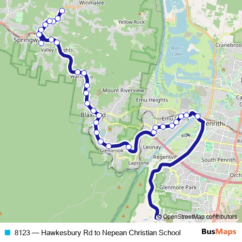 The first stop of the 8123 bus route is Hawkesbury Rd After Gahnia Way and the last stop is Nepean Christian School, School Grounds, Mulgoa Rd. 8123 (Hawkesbury Rd to Nepean Christian School) is operational during on weekdays.