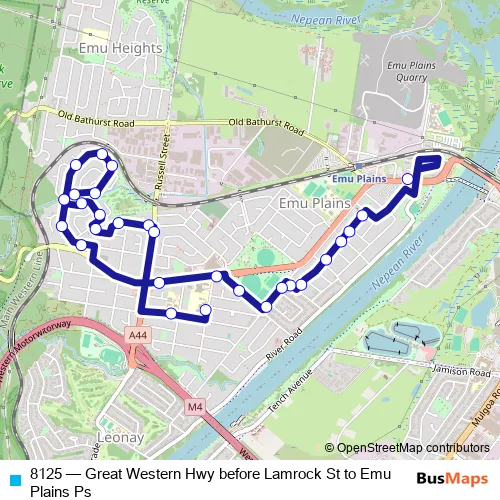 The first stop of the 8125 bus route is Great Western Hwy Opp York St and the last stop is Emu Plains Public School, Emerald St. 8125 (Great Western Hwy before Lamrock St to Emu Plains Ps) is operational during on weekdays.