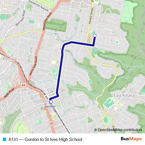 The first stop of the 8131 bus route is Gordon Station, Werona Av, Stand D and the last stop is St Ives High School, Yarrabung Rd. 8131 (Gordon to St Ives High School) is operational during on weekdays.