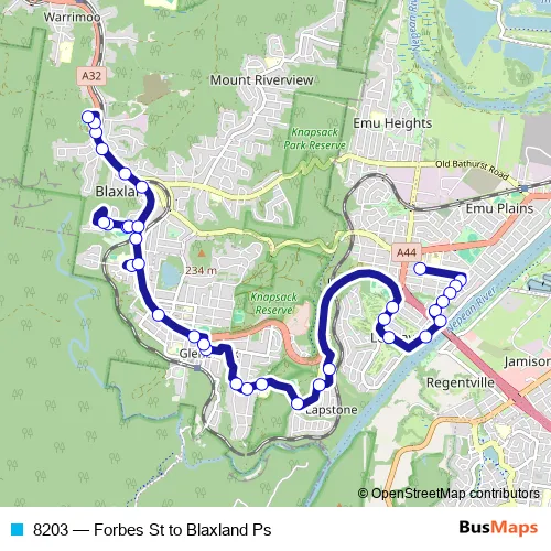 The first stop of the 8203 bus route is Our Lady Of The Way Catholic Primary School, Forbes St and the last stop is Blaxland Public School, Baden Pl. 8203 (Forbes St to Blaxland Ps) is operational during on weekdays.