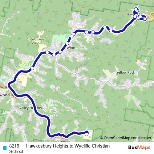 The first stop of the 8216 bus route is Hawkesbury Rd After Booker Rd and the last stop is Wycliffe Christian School, Rickard Rd. 8216 (Hawkesbury Heights to Wycliffe Christian School) is operational during on weekdays.