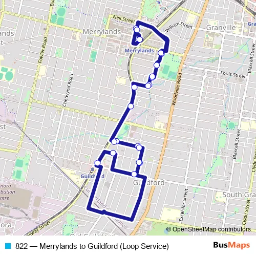 The first stop of the 822 bus route is Merrylands Interchange, Terminal Pl - Stand 2 and the last stop is Merrylands Interchange, Terminal Pl - Stand 2. 822 (Merrylands to Guildford (Loop Service)) is operational during on weekdays.