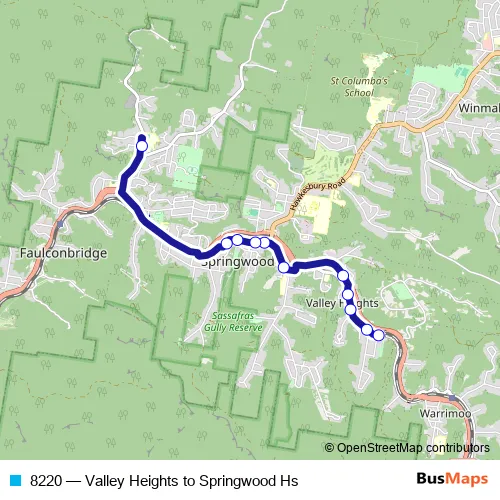 The first stop of the 8220 bus route is Green Pde Before Cambridge St and the last stop is Springwood High School, Grose Rd. 8220 (Valley Heights to Springwood Hs) is operational during on weekdays.