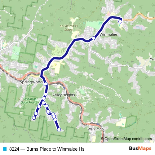 The first stop of the 8224 bus route is Burns Rd After Burns Pl and the last stop is Winmalee Hs. 8224 (Burns Place to Winmalee Hs) is operational during on weekdays.