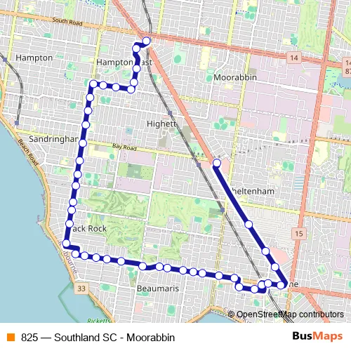 The first stop of the 825 bus route is Moorabbin Station/Nepean Hwy and the last stop is Southland Shopping Centre/Karen St. 825 (Southland SC - Moorabbin) is operational during everyday.