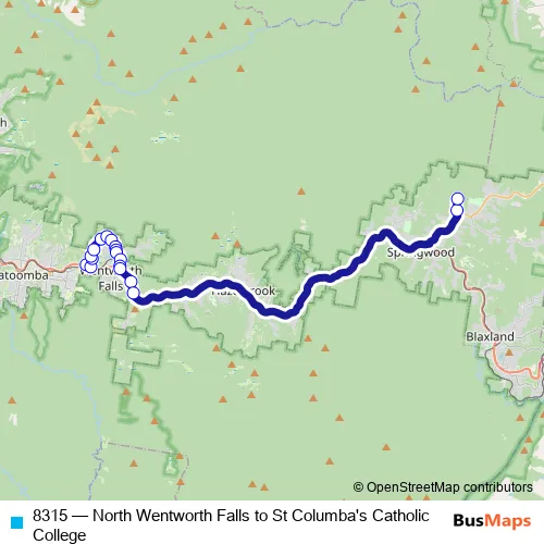 The first stop of the 8315 bus route is Sinclair Cres At Blaxland Rd and the last stop is St Columba's Catholic College, School Grounds. 8315 (North Wentworth Falls to St Columba's Catholic College) is operational during on weekdays.