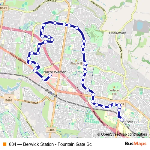 The first stop of the 834 bus route is Berwick Station and the last stop is Fountain Gate SC/Overland Dr. 834 (Berwick Station - Fountain Gate Sc) is operational during everyday.