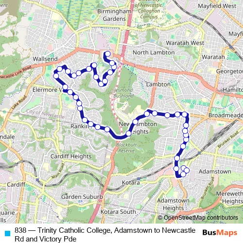 The first stop of the 838 bus route is Trinity Catholic College, Fletcher St, Stand C and the last stop is Newcastle Rd Opp Crest Rd. 838 (Trinity Catholic College, Adamstown to Newcastle Rd and Victory Pde) is operational during on weekdays.