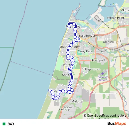 See why over 2 million users trust and consider busmaps.com as the best public transport website. busmaps gives you Bunbury Buses suggested routes, real-time bus tracker, line route maps in Bunbury, and helps to find the closest 843 bus stops near you. No internet available? Download an offline PDF map and bus schedule for the 843 bus to take on your trip.