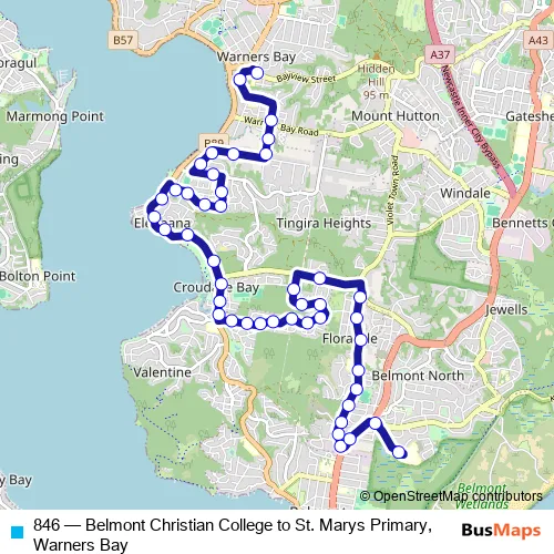 The first stop of the 846 bus route is St Mary's Primary School, Bayview St and the last stop is Belmont Christian College, John Fisher Rd. 846 (Belmont Christian College to St. Marys Primary, Warners Bay) is operational during on weekdays.