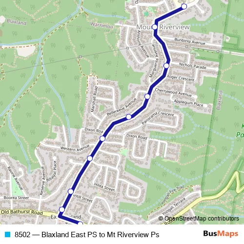 The first stop of the 8502 bus route is Blaxland East Public School, Old Bathurst Rd and the last stop is Mt Riverview Public School, Rusden Rd. 8502 (Blaxland East PS to Mt Riverview Ps) is operational during on weekdays.