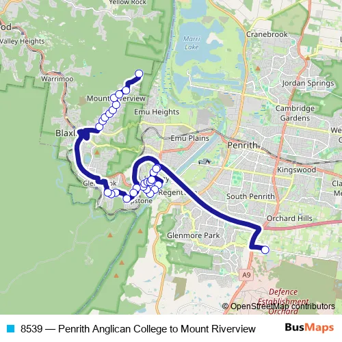 The first stop of the 8539 bus route is Cross Rd Penrith Anglican College and the last stop is Grand View Dr Opp Vista Pde. 8539 (Penrith Anglican College to Mount Riverview) is operational during on weekdays.