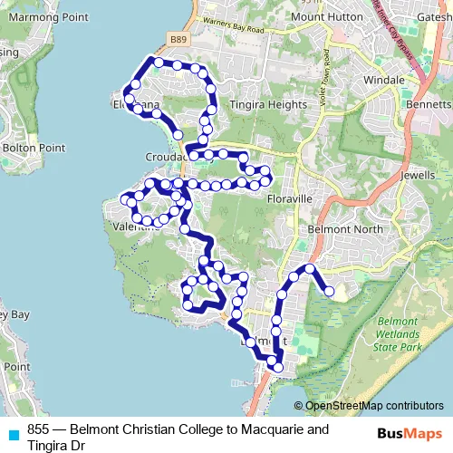 Click here to view the nearest 855 - Belmont Christian College to Macquarie and Tingira Dr bus stop.