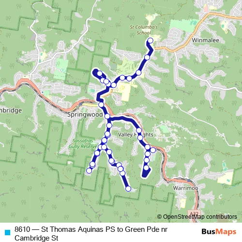 The first stop of the 8610 bus route is St Thomas Aquinas Primary School, Hawkesbury Rd and the last stop is Green Pde Opp Cambridge St. 8610 (St Thomas Aquinas PS to Green Pde nr Cambridge St) is operational during on weekdays.