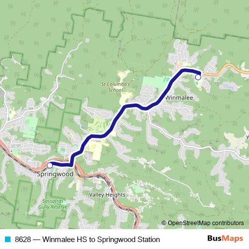 The first stop of the 8628 bus route is Winmalee Hs and the last stop is Macquarie Rd Opp Springwood Station. 8628 (Winmalee HS to Springwood Station) is operational during on weekdays.
