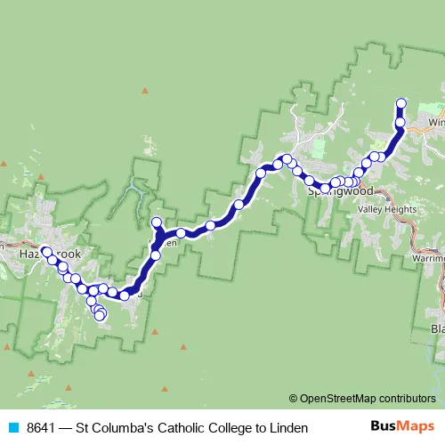 The first stop of the 8641 bus route is St Columba's Catholic College, School Grounds and the last stop is Glossop Rd At Dawes Av. 8641 (St Columba's Catholic College to Linden) is operational during on weekdays.