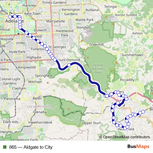 The first stop of the 865 bus route is Stop D1 Currie St - North side and the last stop is Stop 44 Mt Barker Rd - North side. 865 (Aldgate to City) is operational during on weekdays.