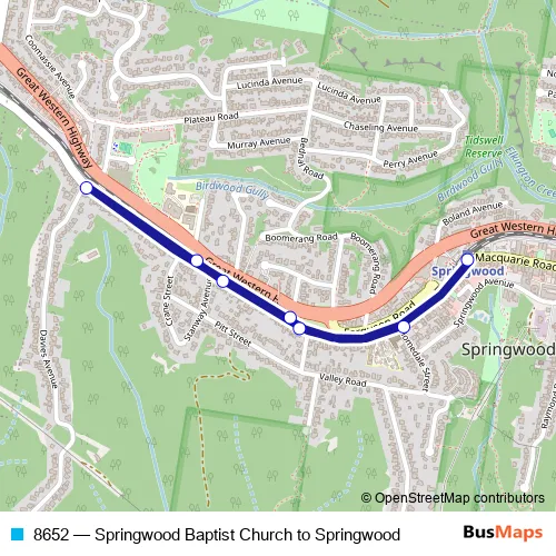 The first stop of the 8652 bus route is Springwood Baptist Church, Macquarie Rd and the last stop is Springwood Station, Macquarie Rd. 8652 (Springwood Baptist Church to Springwood) is operational during on weekdays.