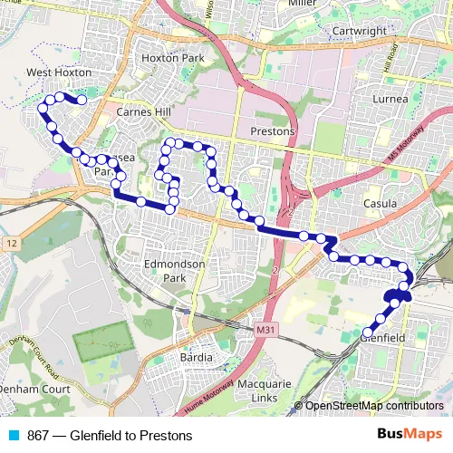 The first stop of the 867 bus route is Glenfield Station, Railway Pde and the last stop is Greenway Park, Greenway Dr. 867 (Glenfield to Prestons) is operational during on weekdays.