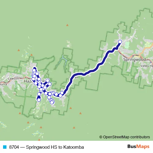 The first stop of the 8704 bus route is Springwood High School, Grose Rd and the last stop is Railway Pde Opp Hazelbrook Station. 8704 (Springwood HS to Katoomba) is operational during on weekdays.