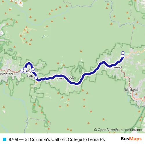 The first stop of the 8709 bus route is St Columba's Catholic College, School Grounds and the last stop is Sinclair Cres At Great Western Hwy. 8709 (St Columba's Catholic College to Leura Ps) is operational during on weekdays.