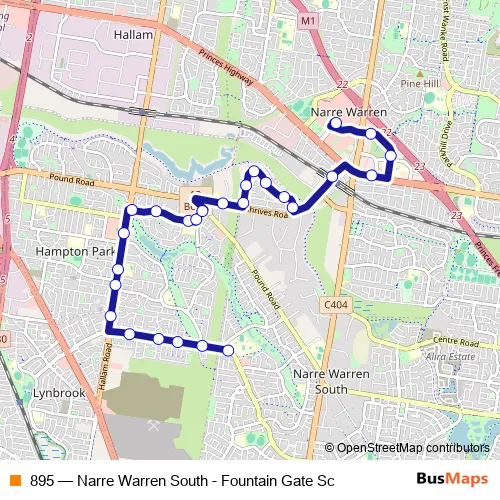 The first stop of the 895 bus route is Narre Warren South College/Ormond Rd and the last stop is Fountain Gate SC/Overland Dr. 895 (Narre Warren South - Fountain Gate Sc) is operational during everyday.