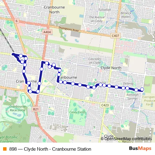The first stop of the 898 bus route is Cranbourne Station/Station St and the last stop is Heather Gr/Tuckers Rd. 898 (Clyde North - Cranbourne Station) is operational during everyday.