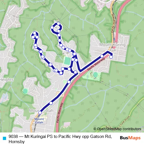 The first stop of the 9038 bus route is Mount Kuring-Gai Public School, Leeming St and the last stop is Mt Colah Station, Pacific Hwy. 9038 (Mt Kuringai PS to Pacific Hwy opp Gatson Rd, Hornsby) is operational during on weekdays.
