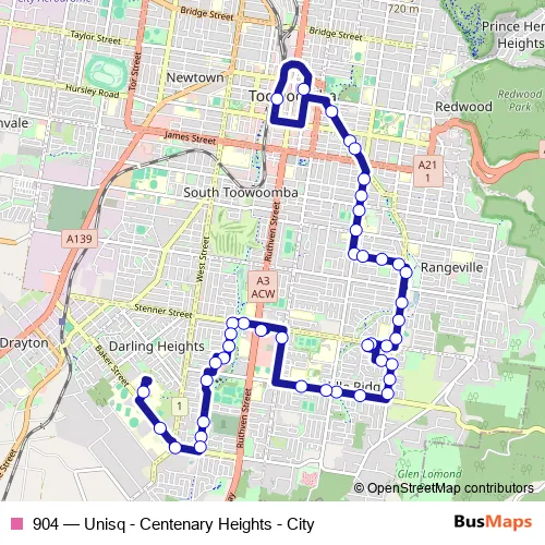 The first stop of the 904 bus route is Toowoomba bus station stop 2a and the last stop is Unisq Central. 904 (Unisq - Centenary Heights - City) is operational during everyday.