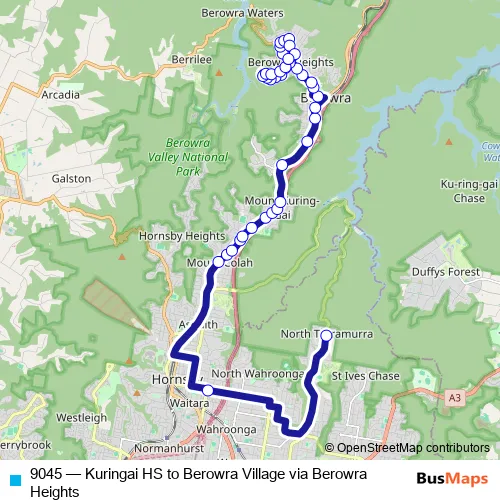 The first stop of the 9045 bus route is Ku-ring-gai Creative Arts High School, Bobbin Head Rd and the last stop is Turner Rd After Berowra Waters Rd. 9045 (Kuringai HS to Berowra Village via Berowra Heights) is operational during on weekdays.