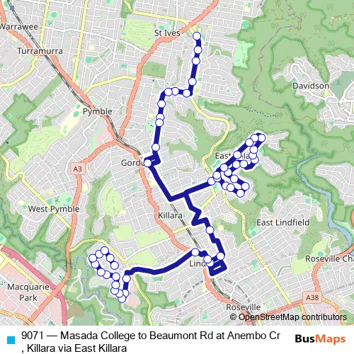 The first stop of the 9071 bus route is Masada College, Link Rd and the last stop is Beaumont Rd At Anembo Cres. 9071 (Masada College to Beaumont Rd at Anembo Cr, Killara via East Killara) is operational during on weekdays.