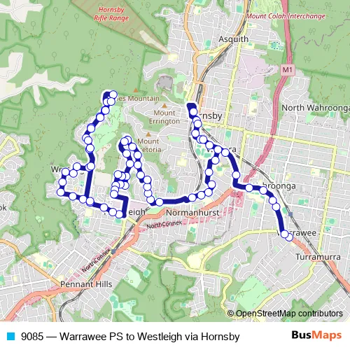 Click here to view the nearest 9085 - Warrawee PS to Westleigh via Hornsby bus stop.