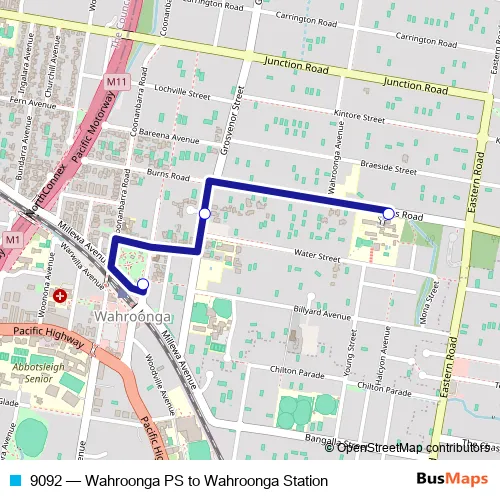 The first stop of the 9092 bus route is Wahroonga Public School, Burns Rd and the last stop is Wahroonga Station, Illoura Av. 9092 (Wahroonga PS to Wahroonga Station) is operational during on weekdays.